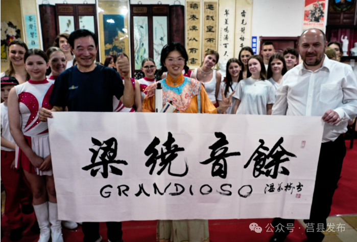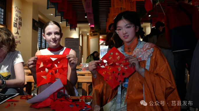 在剪纸展馆,她协助非遗传承人于红老师教外国朋友如何剪出一个简单而漂亮的图案,同时对过门笺里的内容、故事也讲得头头是道,“这幅反映了中国共产党领导人民建立新中国的故事,这幅介绍中国改革开放带来的发展变化,这幅的两边刻的是中国龙,这幅讲述了中国古代英雄岳飞的故事......”在文心珍藏馆,他请书法家爷爷为乐队题写“余音绕梁”,并鼓励乐队指挥达里乌什·克拉耶夫斯基尝试用毛笔在书法上写下乐队的名字,这幅中波合作的书法完成后,引来一阵掌声。