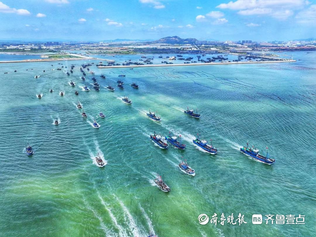 9月1日中午12时,经过漫长的四个月的伏季休渔期,在日照黄海中心渔港,伴随着响亮的汽笛声和喧天的锣鼓声,一艘艘渔船如离弦之箭,驶出渔港,渔民们再次驶向大海,开启新一轮的“耕海牧渔”。