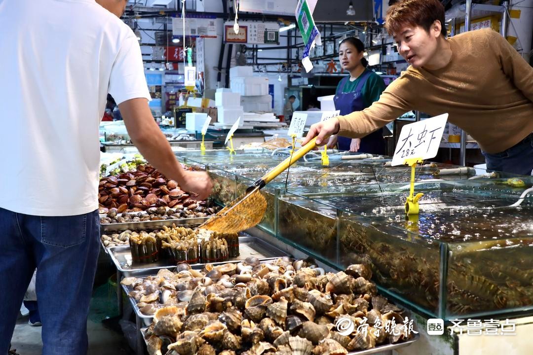 “李红大美丽品食”店的老板孙先生介绍,自家店里鱼类、虾类、贝类等种类齐全,最近临近假期,生意格外好,帝王蟹每天都能卖出去10多只。