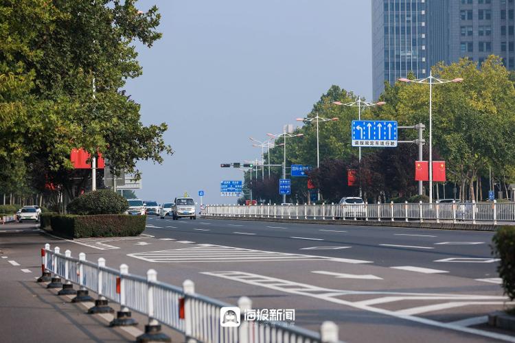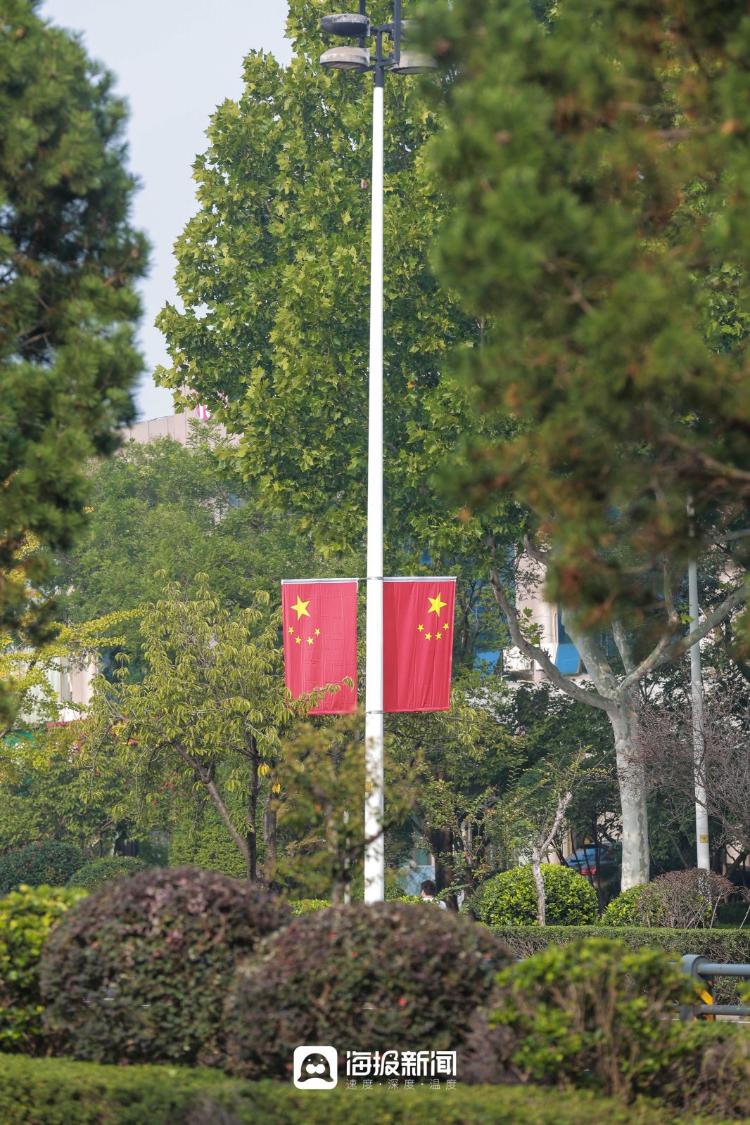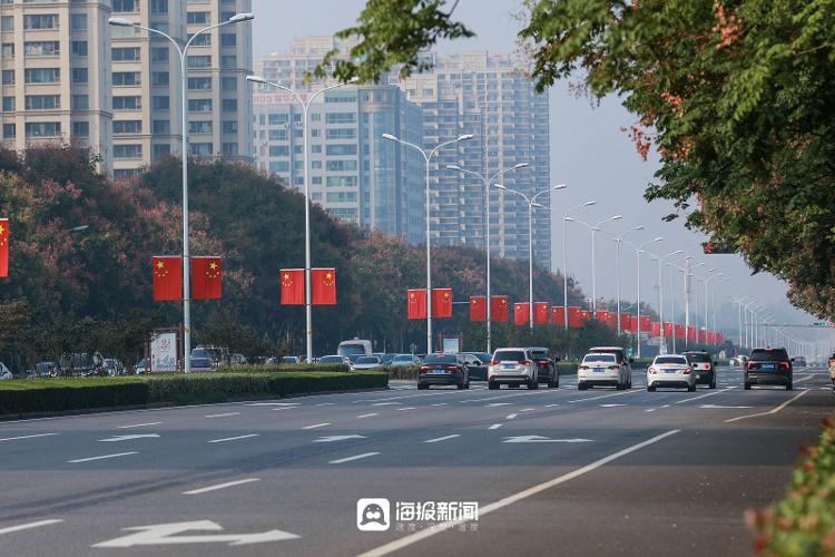 9月29日下午,日照市东港区烟台路、济南路、北京路路段,路灯杆上均已整齐悬挂好五星红旗,两两对称,鲜亮的色彩与蓝天白云相互映衬,车辆穿梭其间,满城生机盎然。
