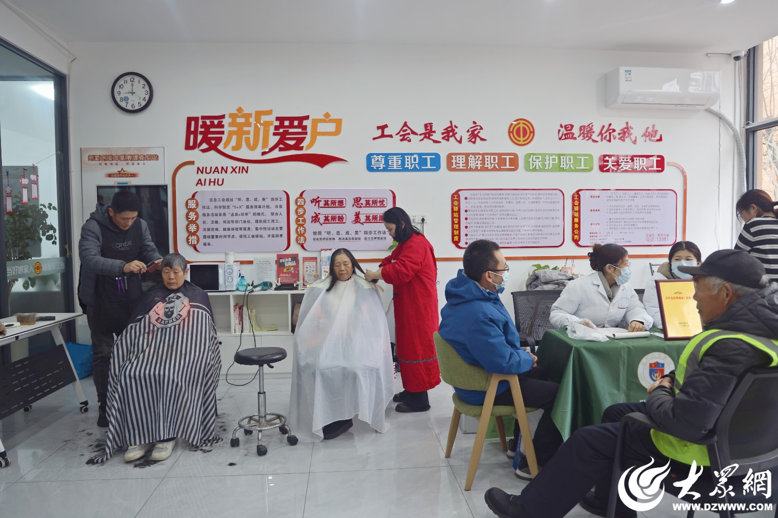 活动现场还设有健康服务区,医务人员为劳动者免费测量血压、血糖,并提供健康咨询与管理建议。一旁的理发志愿者也细心为大家修剪发型,焕新面貌。参与者们手捧腊八粥,围坐在一起,分享理发的喜悦,交流健康管理的贴心提示……整个驿站在这一刻被浓浓的温情所包围。