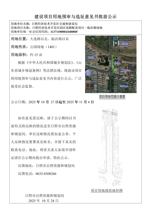 10月24日,日照市自然资源和规划局网站发布《日照经济技术开发区交通和建设局日照经济技术开发区园区道路配套项目——临沂路绿地建设项目用