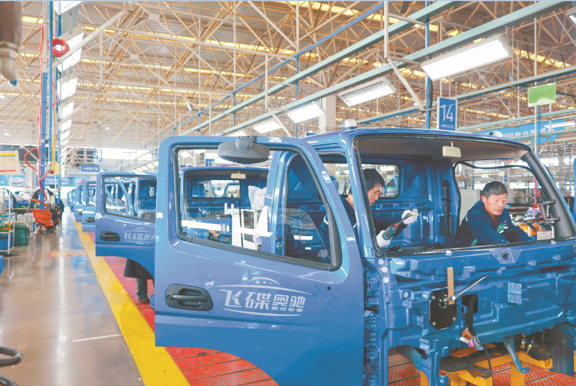 3月21日,在五征集团生产厂区的飞碟汽车总装车间里,工人们正在进行汽车总装作业。