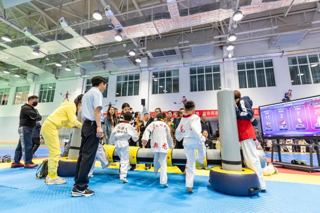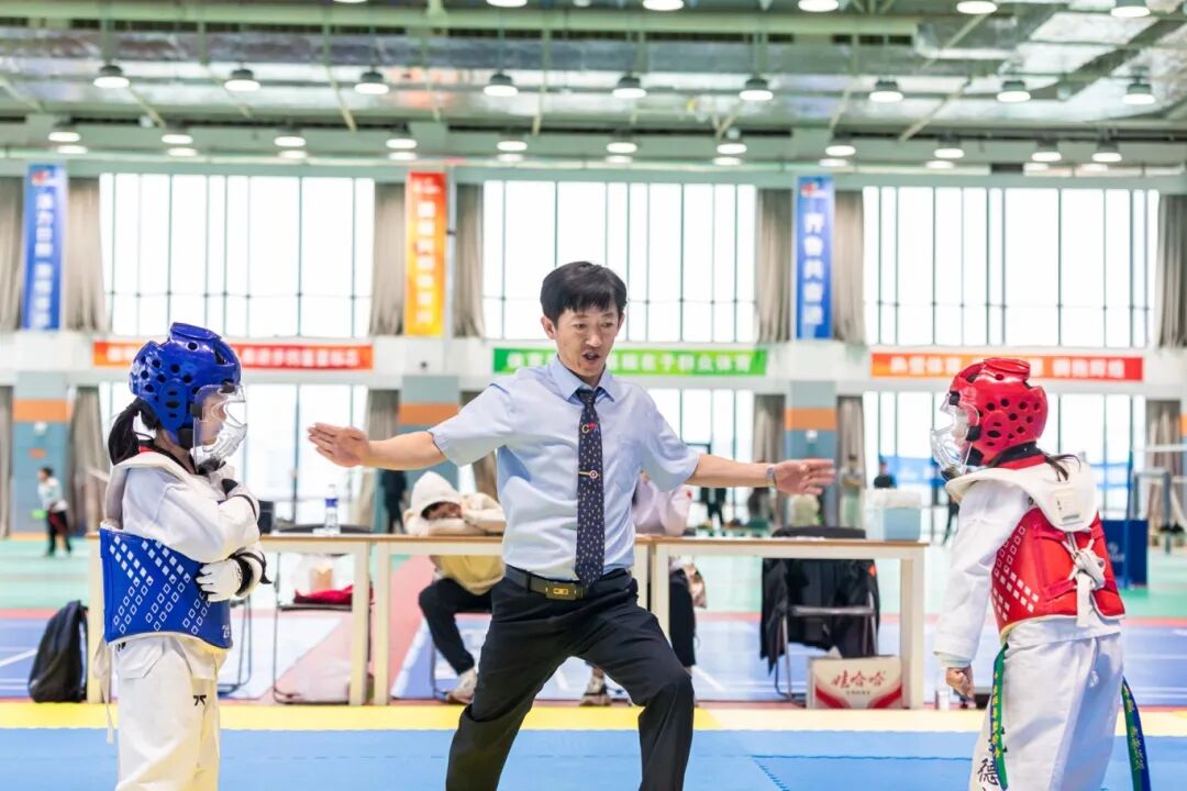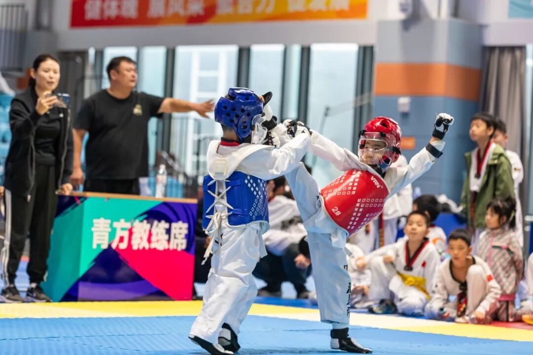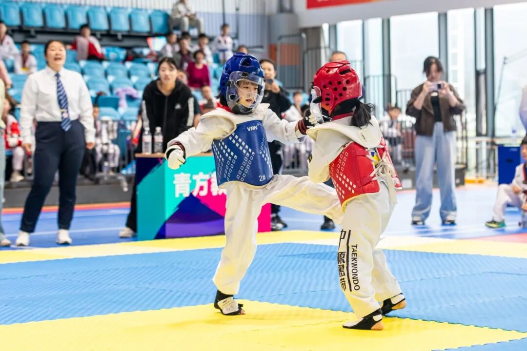 比赛中,运动员们身穿白色跆拳道服,头戴护具面罩,展现出了极高的专业素养和竞技水平。横踢、后旋踢等招式凌厉出击,闪躲、格挡间展示出交战双方的敏捷反应,你来我往的激烈对抗,引得现场观众阵阵欢呼。场边,教练们紧盯赛场,实时喊出战术指导;家长们则握紧拳头,目光锁定自家孩子,现场的紧张氛围与青春活力交织碰撞。