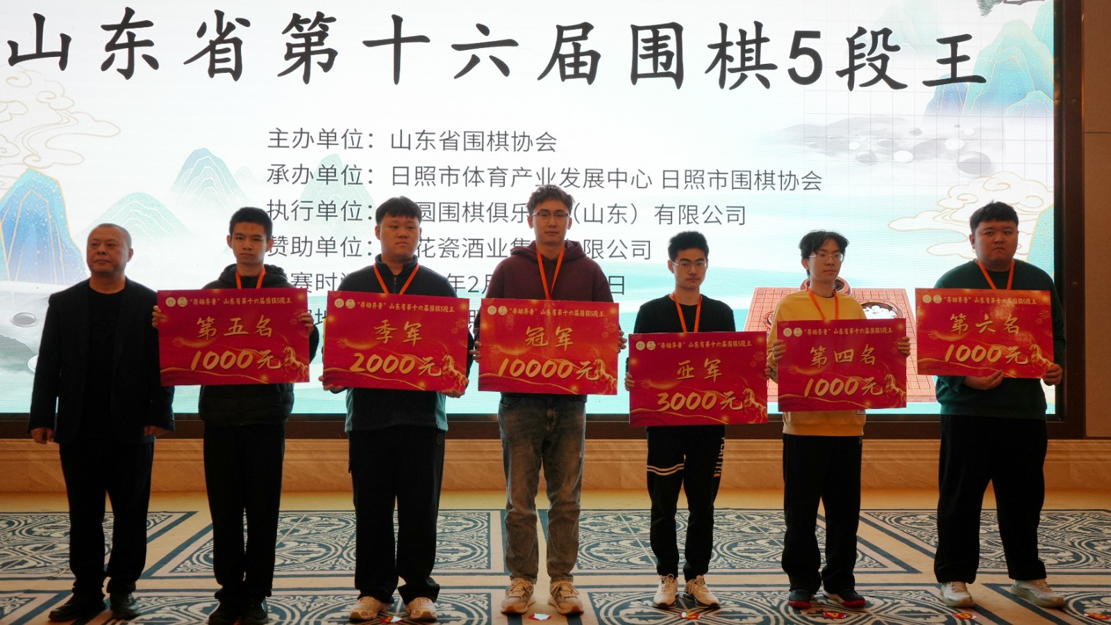 本次竞赛组别分为3段组、4段组、5段组,各组前十二名颁发荣誉证书,5段组前六名分别给予现金奖励。经过为期三天的激烈角逐,来自青岛的赵季昊、济南的孔祥涵、潍坊的宋俊宇分获5段组比赛的冠亚季军,分别获得10000元、3000元、2000现金奖励,四到六名也各获得1000元现金奖励。其中,5段组前两名的赵季昊、孔祥涵两位棋手在本次比赛中成功升为业余6段。