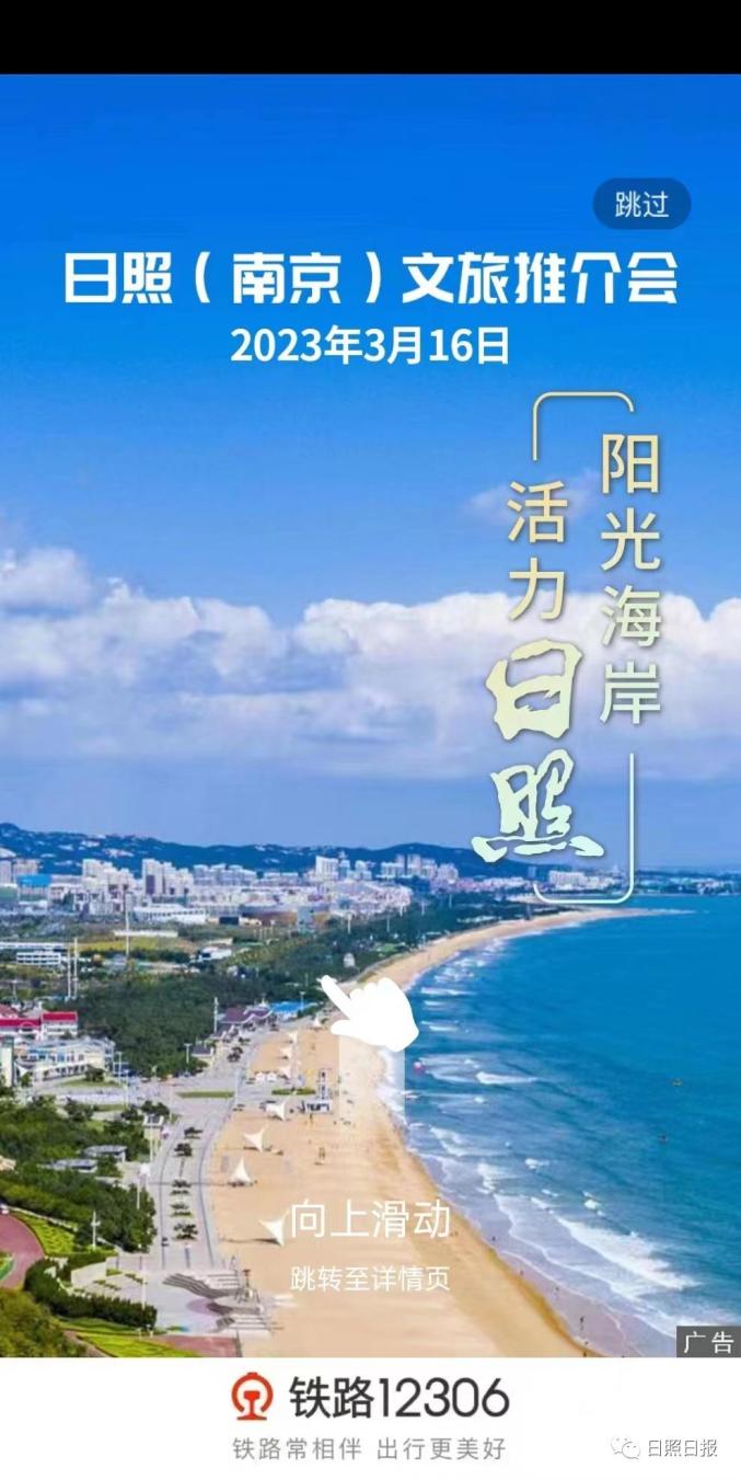 值得一提的是,本次活动得到了铁路12306平台的大力支持,专门为江苏的朋友们设计了12306APP开屏链接,活动当天只要在江苏境内打开APP,开屏即看到“阳光海岸 活力日照”精美海报,跟随提示操作即可链接到文旅日照微信公众号关于“春暖花开·相约日照”主题宣推活动的详情介绍。