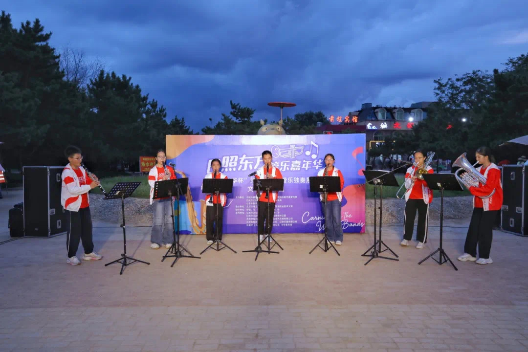 在日照海滨国家森林公园,7人合奏《残酷天使的行动纲领》以明快节奏开篇,尽显团队合奏的默契;管乐重奏《波基进行曲》《彩云追月》融合中西元素,熟悉的旋律引发观众共鸣;管乐版《Dance Monkey》则以新颖演绎展现艺术多元性,让现场氛围愈显活跃。