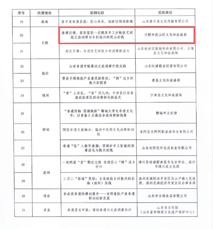 "日照茶手工炒制技艺"是岚山区的特色文化名片,岚山区紧抓这一核心资源,以“保护传承为基础、融合发展为路径、促进消费为目标”,探索出一条非遗助力消费、赋能乡村振兴的特色发展之路。