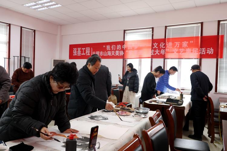 活动现场红纸翻飞、墨香四溢,洋溢着浓浓的年节氛围。山海天美协的书画家们齐聚一堂,倾情创作,各展才艺。一幅幅色彩鲜活、充满乡土气息的农民画引人驻足,以质朴笔触绘就田园诗意,展现出创作者扎根生活的艺术积淀与乡土情怀。书画案前,艺术家们凝神走笔、挥洒自如,手腕起落间,一副副寓意吉祥的春联、一张张圆润饱满的“福”字、一件件意趣盎然的国画作品便跃然纸上。