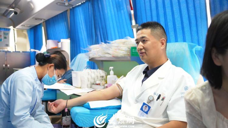 此次献血队伍涵盖区卫健局、红十字会、人民医院等区直单位及8个乡镇街道医疗机构的医务人员。“我作为医务人员踊跃报名,在这里和大家科普一下,无偿献血对人体300-400毫升,人体机能是不存在什么损害的,有些方面还是有益的,呼吁广大群众参与献血行列当中。”岚山区巨峰中心卫生院党支部书记孙斌在献血时呼吁。
