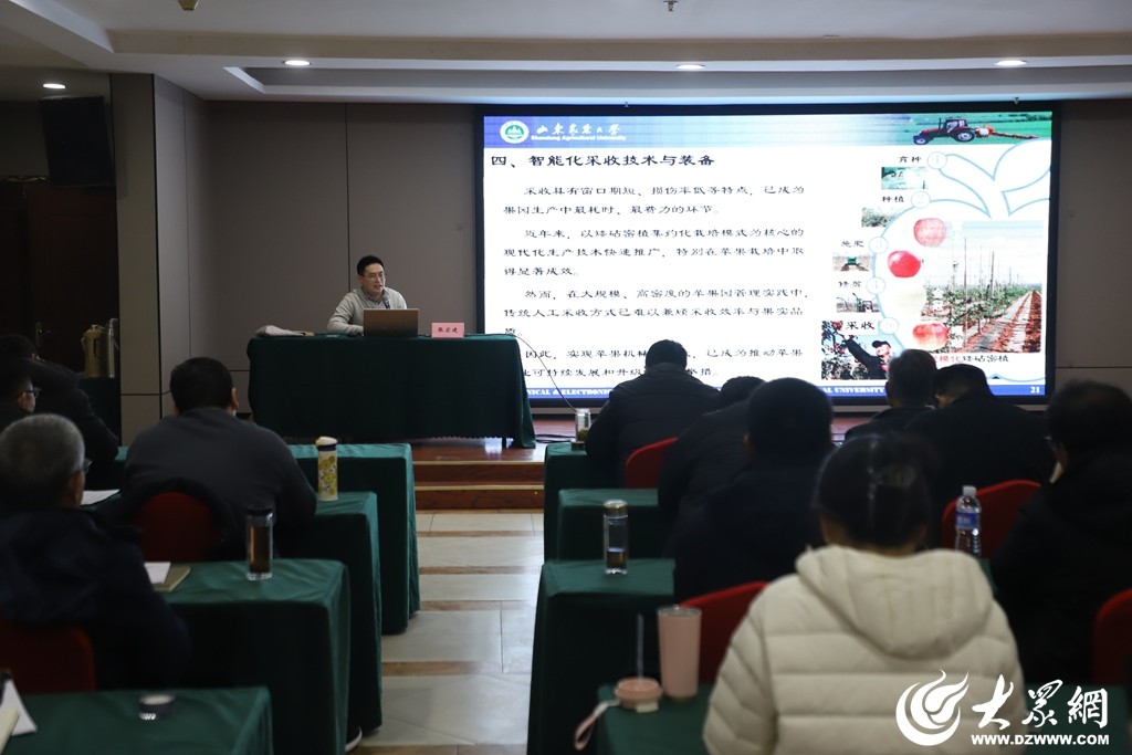 在集中授课环节,邀请了山东农业大学农业机械化系主任张宏建等业内知名专家,围绕“智慧果园机械化关键技术与装备”“林果产业主要自然灾害与防灾减灾技术”“苹果主要病害发生情况及防治措施”等专题进行了深入讲解。专家们的授课内容既具有理论深度,又贴近实际生产需求,为参训学员提供了宝贵的知识财富。