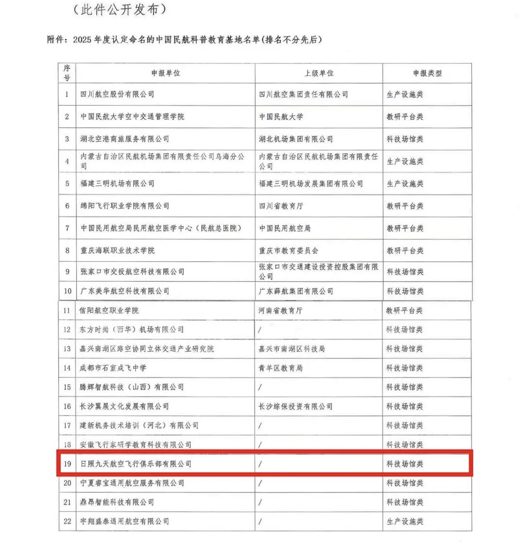 近日,中国民航科普基金会公布2025年度中国民航科普教育基地名单,由岚山区交通运输局推选的日照九天航空飞行俱乐部有限公司成功入选,成为该批次山东省唯一获此殊荣的单位。