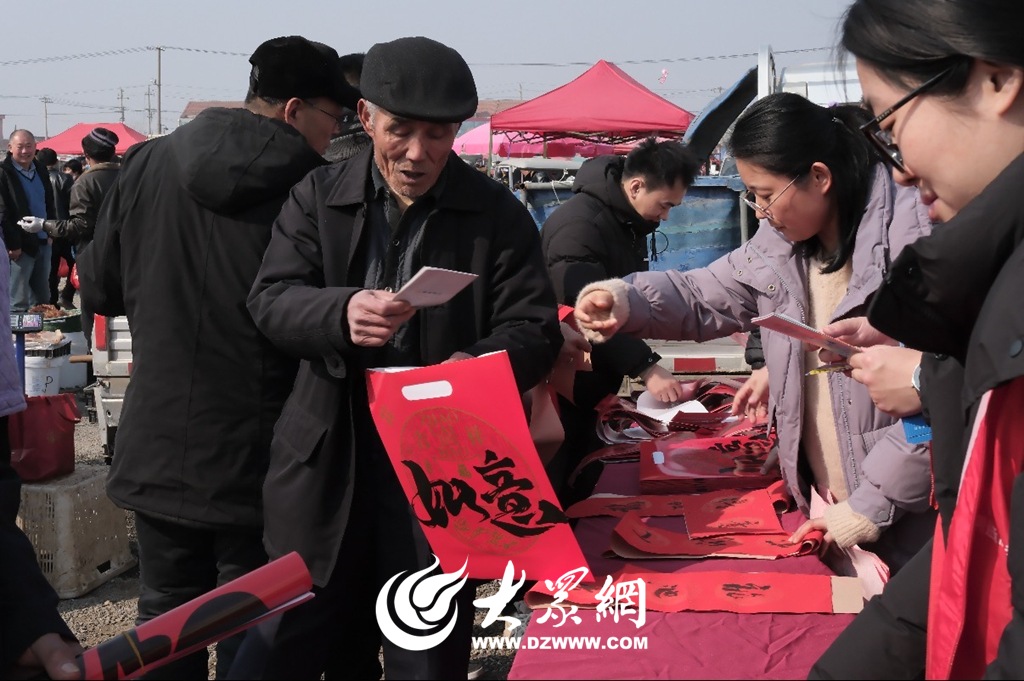 活动现场墨香与宣讲声交织、暖意与年味相融,成为大集上最亮眼的风景线。活动伊始,文艺志愿者带来自编自演的快板《赞碑廓》,节奏明快、朗朗上口的唱词,既赞美了碑廓镇近年来在乡村振兴、民生改善、文明建设等方面的丰硕成果,也生动诠释惠民政策给群众生活带来的巨大变迁,接地气的表演赢得现场群众阵阵掌声,迅速点燃了活动氛围,让大集的年味愈发浓厚。书法爱好者、文艺志愿者齐聚一堂,挥毫泼墨、笔走龙蛇,将新春祝福凝于笔端。一副副饱含吉祥寓意的春联、一张张喜庆灵动的 “福” 字跃然纸上,既有传统年味,也饱含对美好生活的祝福,吸引众多群众驻足观赏、有序领取。