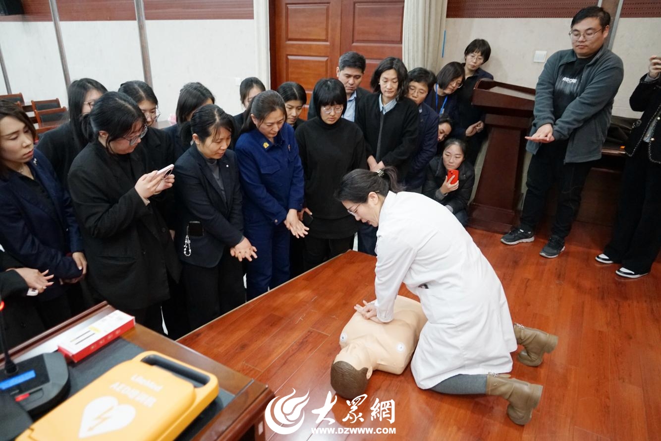 急救知识培训邀请日照市中心医院专业医护人员进行专题授课。医护人员采用理论讲解与实操演示相结合的方式,重点培训了心肺复苏规范操作、气道异物梗阻急救方法等关键技能,现场演示心脏复苏操作流程和自动体外除颤仪(AED)的使用步骤,设置模拟演练环节,确保参训人员真正掌握、学以致用。
