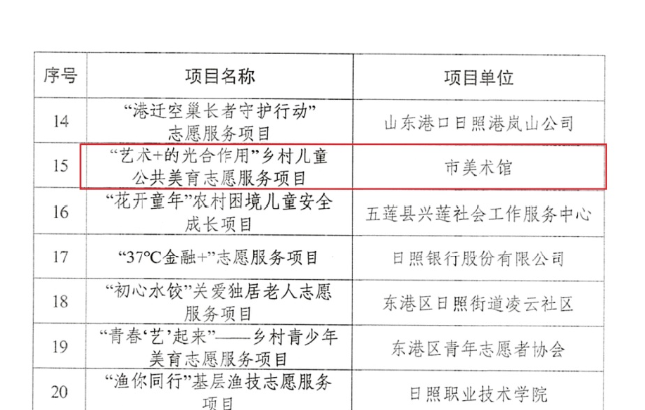 近日,日照市委社会工作部印发《关于公布日照市志愿服务优秀项目库首批项目名单的通知》,市美术馆发起的艺术+的光合作用乡村儿童公共美育